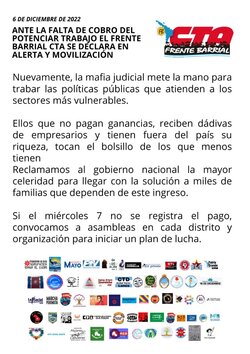 ANTE LA FALTA DE COBRO DEL POTENCIAR TRABAJO EL FRENTE BARRIAL CTA SE DECLARA EN ALERTA Y MOVILIZACIÓN