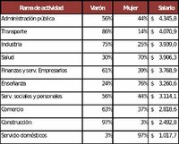 Los varones se insertan mayoritariamente en los sectores de actividad donde los salarios son más elevados. Los sectores de la Administración pública, el transporte y la Industria son los sectores con salarios promedios más altos y allí los varones son mayoría. Mientras que en la enseñanza y la Salud con salarios promedios menores las mujeres son mayoría. En el sector de la enseñanza, que es un sector altamente feminizado, un 76% de mujeres y un 24% de varones, verificamos que las mujeres ganan en promedio menos que los varones, la brecha es del 22%.