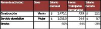 Si miramos dos sectores, uno masculinizado cómo la construcción y otro feminizado cómo el trabajo en casas particulares, ambos caracterizados por los bajos niveles registración y los bajos niveles de instrucción alcanzados por quienes lo desempeñan observamos que el salario mensual de las mujeres es de un 59% menos que el de los varones y que lo que cobran por hora es un 26% menos.