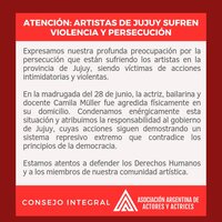 La Asociación Argentina de Actores y Actrices expresa su profunda preocupación por la persecución que están sufriendo los artistas en la provincia de Jujuy, siendo víctimas de acciones intimidatorias y violentas.