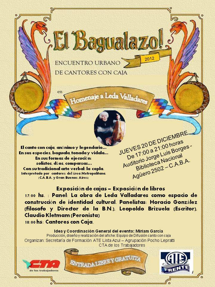 El jueves 20 de diciembre a las 17 hs, en el auditorio Jorge Luis Borges de la Biblioteca Nacional (Agüero 2502), se realizará el Bagualazo 2012, tercera edición de un encuentro urbano de cantores con caja. En ese marco se concretará un homenaje póstumo a la folclorista fallecida Leda Valladares.