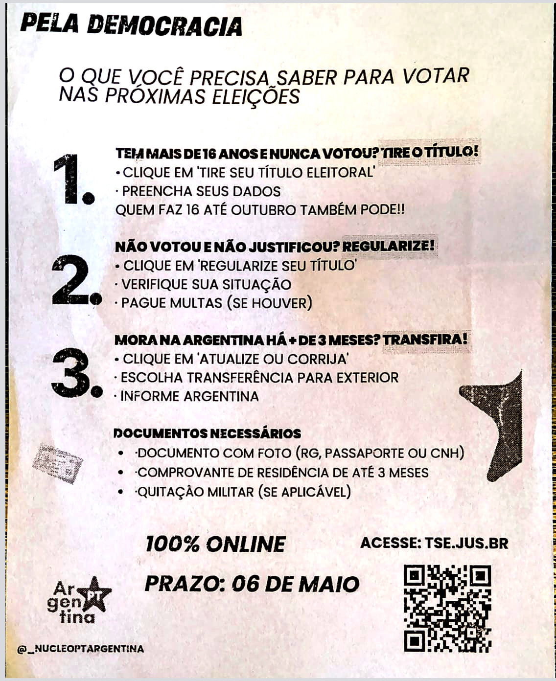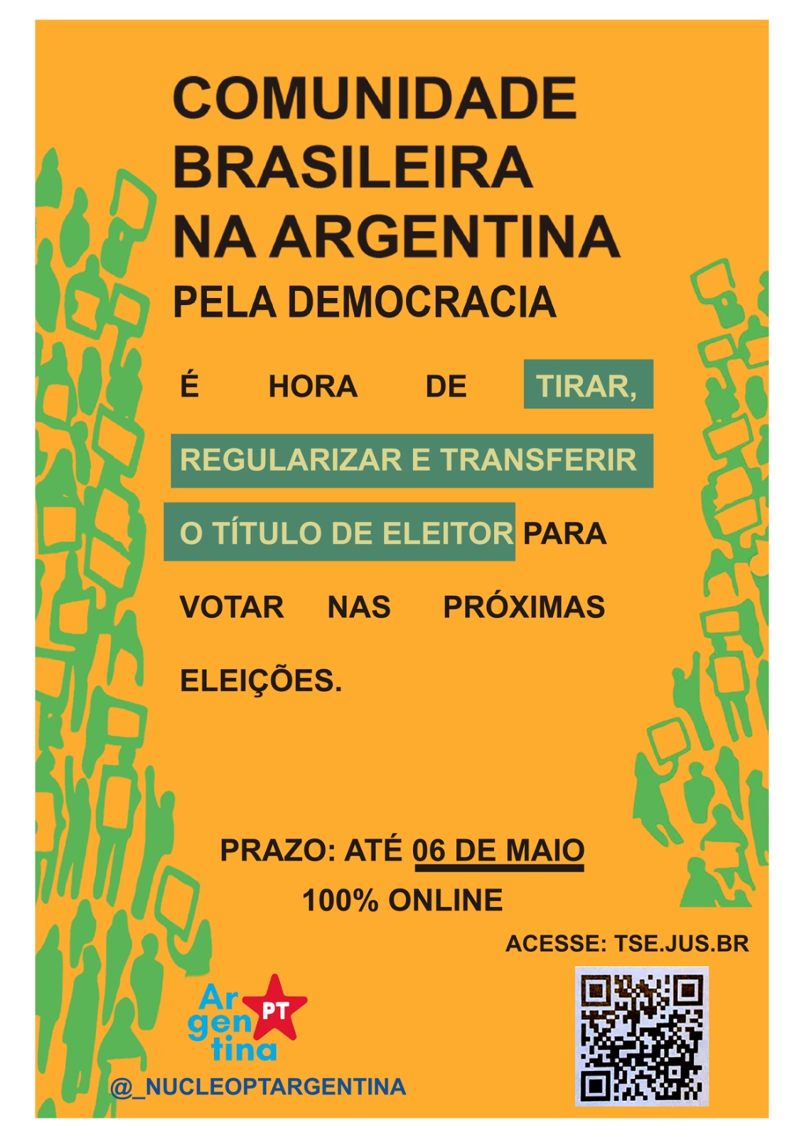 A comunidade brasileira residente na Argentina está convocada a regularizar sua situação eleitoral para participar das próximas eleições no Brasil. O processo é simples, totalmente online e deve ser realizado até 06 de maio, por meio do site do Tribunal Superior Eleitoral (TSE).