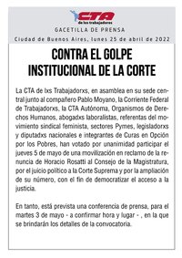 La CTA de lxs Trabajadorxs, en asamblea en su sede central junto al compañero Pablo Moyano, la Corriente Federal de Trabajadorxs, la CTA Autónoma, Organismos de Derechos Humanos, abogadxs laboralistas, referentas del movimiento sindical feminista, sectores Pymes, legisladorxs y diputadxs nacionales e integrantes de Curas en Opción por los Pobres, han votado por unanimidad participar el jueves 5 de mayo de una movilización en reclamo de la renuncia de Horacio Rosatti al Consejo de la Magistratura, por el juicio político a la Corte Suprema y por la ampliación de su número, con el fin de democratizar el acceso a la justicia.