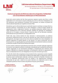 Desde LAB, central sindical del País Vasco queremos expresar nuestra más firme y activa solidaridad con la convocatoria conjunta realizada por la CGT, la CTA de los Trabajadores y la CTA Autónoma, para movilizarse el próximo 18 de diciembre, en rechazo al proyecto de reforma laboral impulsado por el gobierno de Javier Milei.