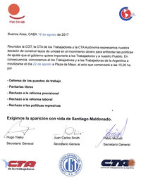 Reunidos la CGT, la CTA de los Trabajadores y la CTA Autónoma expresamos nuestra decisión de construir lazos de unidad en el movimiento obrero para enfrentar las políticas de ajuste que el gobierno quiere imponerle a los Trabajadores y a nuestro Pueblo. En consecuencia, convocamos al los Trabajadores y a las Trabajadoras de la Argentina a movilizarse el día 22 de agosto a Plaza de Mayo, al acto que comenzará a las 15,00 hs, por: