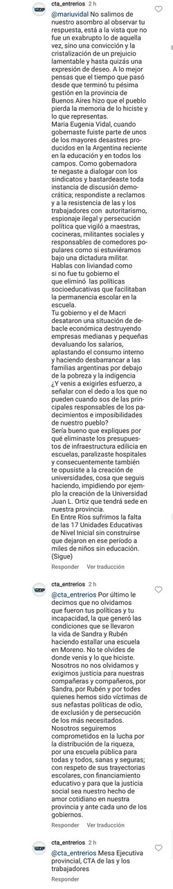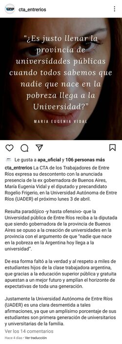 La central entrerriana recordó, en una publicación en su cuenta de Instagram, la postura de Vidal respecto a la educación superior, cuando fue gobernadora de Buenos Aires. Lo que fue comentado por ella y replicado a su vez por la Mesa Ejecutiva provincial de la Central de Trabajadores y Trabajadoras de la Argentina.