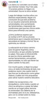 La educación es el único camino para recuperar Argentina, estoy convencida y sé que ustedes también lo saben. Pero para mí EDUCACIÓN es que los chicos aprendan, que sumen herramientas y encuentren oportunidades, no solo que llenen las aulas cuando no hay paro.