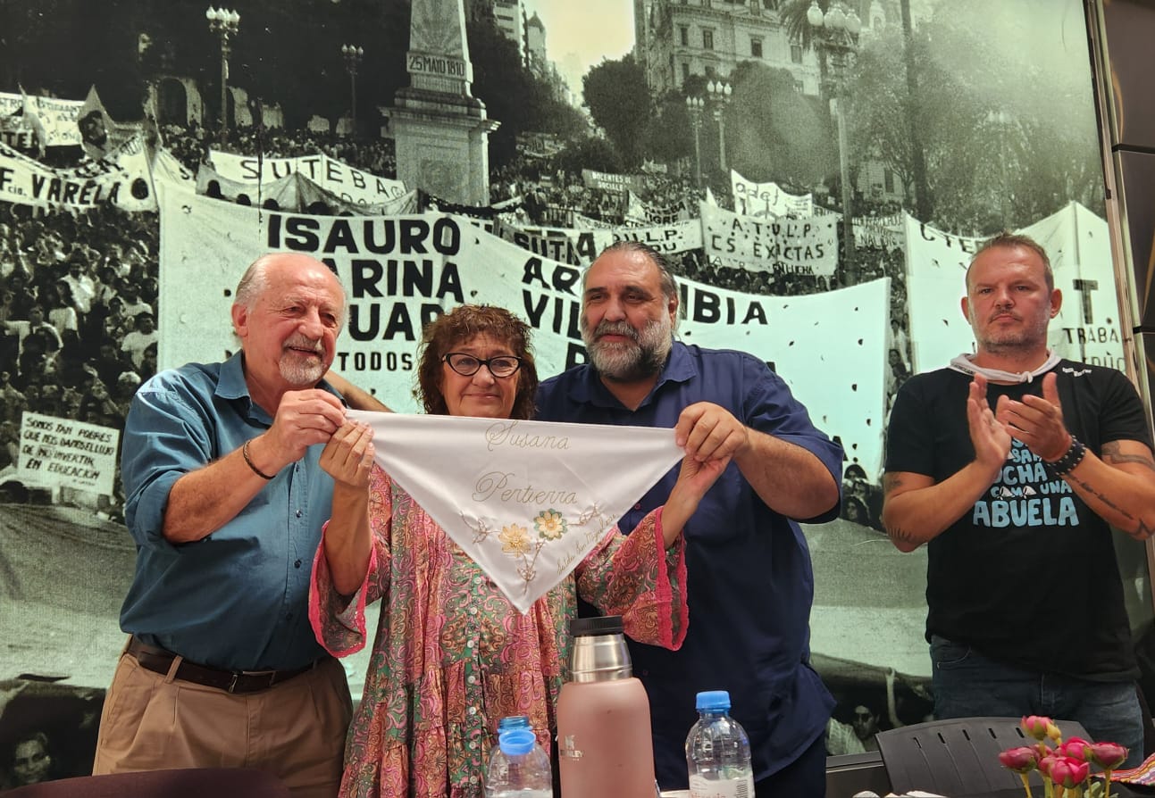 “Ayer, esa marea humana hizo naufragar al negacionismo”, aseguró Hugo Yasky, y agregó: “La derecha nunca llega de un día para el otro. Se va incubando el huevo de la serpiente. Del mismo modo, los triunfos populares nunca aparecen de un día para el otro. Se van construyendo. Se van produciendo hechos que, en cuanto tienen el protagonismo del pueblo, se van generando líneas de las que no se retrocede. Y eso fue lo que sucedió ayer. Comenzar a construir los mojones de la derrota de Milei en 2027”, subrayó. Y llevó un presente para Sonia y para Robi: Un pañuelo bordado por docentes del SUTEBA, de la seccional San Miguel, que tiene el nombre de Susana Pertierra, directora de escuela en General Sarmiento (hoy Malvinas Argentinas), compañera de Stella Maldonado, y trabajadora secuestrada por la última dictadura cívico militar mientras trabajaba.