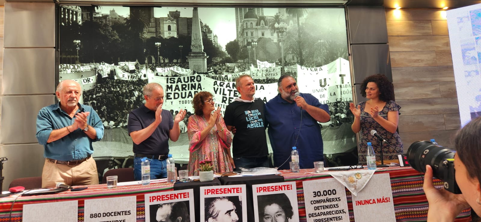 Luego, se proyectó un video en homenaje a lxs 880 docentes detenidxs, desaparecidxs y asesinadxs por la dictadura cívico militar.