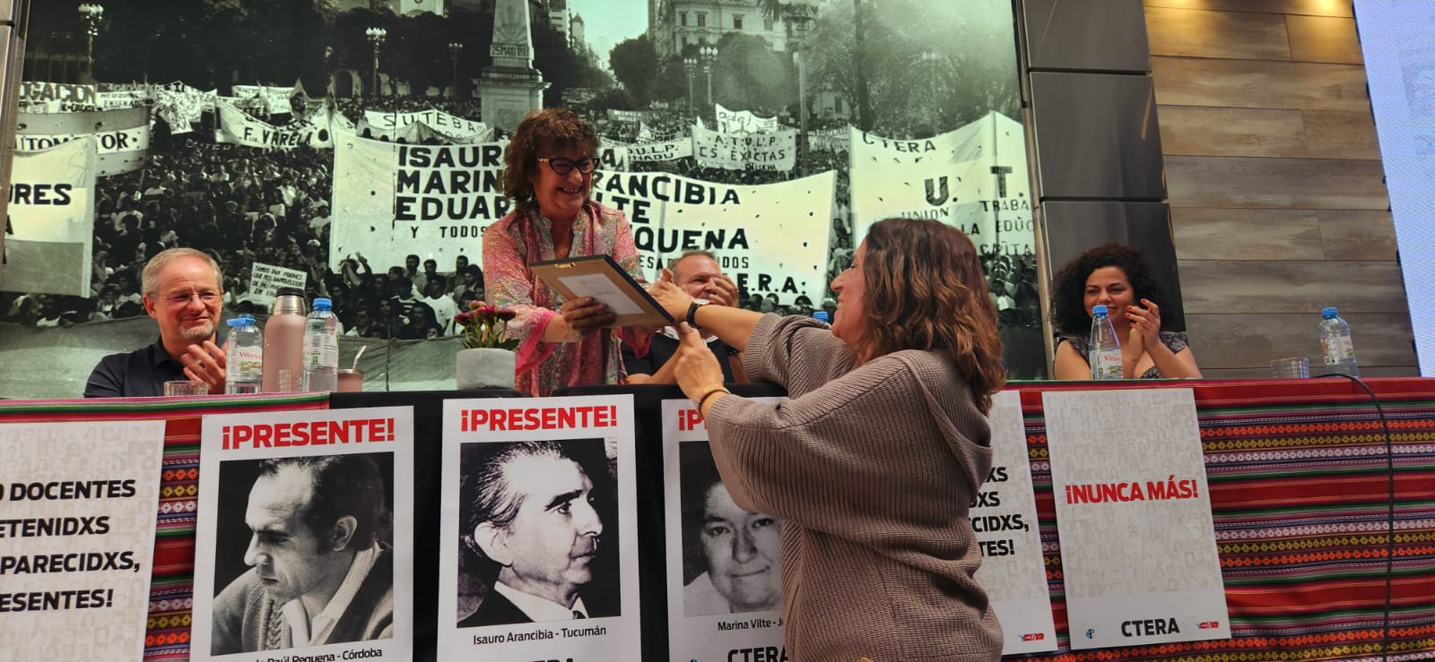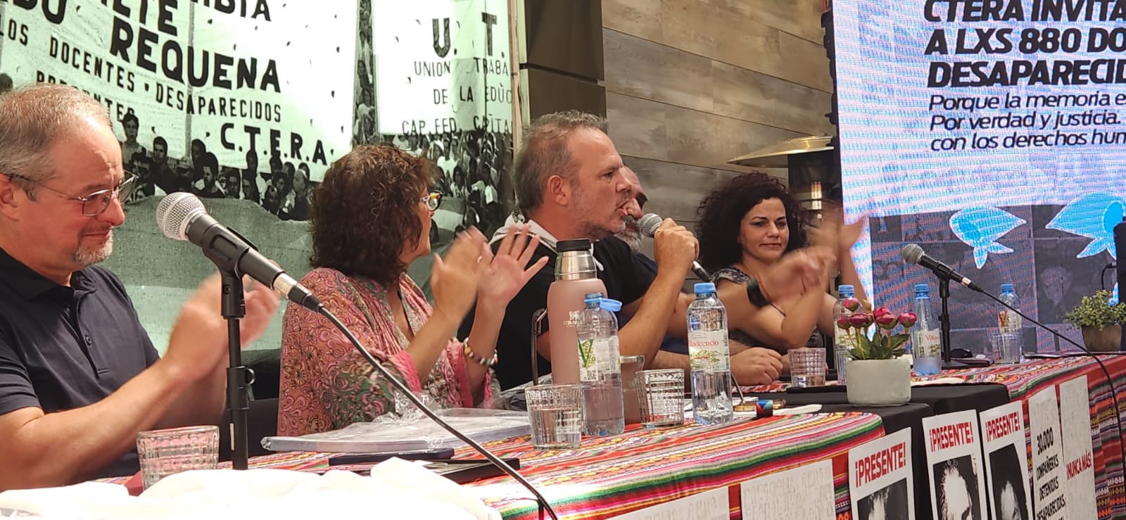 Entre otrxs compañerxs, se contó con la presencia de David Edwards, secretario general de la IE; Sonia Alesso, secretaria general de la CTERA; Hugo Yasky, secretario general de la CTA-T y diputado nacional; Roberto Baradel, secretario adjunto de la CTERA y secretario de Relaciones Internacionales de la CTA-T; Charly Pisoni, integrante de H.I.J.O.S. Capital, y Gabriela Bonilla, directora regional de la Internacional de la Educación para América Latina (IEAL), de Costa Rica, quienes compartieron unas palabras con lxs presentes.