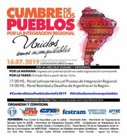 La convocatoria a esta Cumbre de los Pueblos por la Integración Regional en la ciudad de Santa Fe parte del movimiento obrero organizado al cual se han sumado organizaciones sociales, de pymes y una diversidad de agrupaciones, movimientos, estructuras de base, con una intensa variedad de temas y prácticas.
