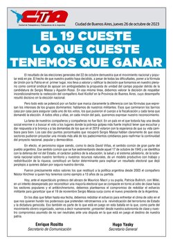 El resultado de las elecciones generales del 22 de octubre demuestra que el movimiento nacional y popular está en pie. El hecho de que nuestro pueblo haya decidido, a pesar de todas las dificultades, poner a la fórmula de Unión por la Patria en el primer lugar, nos lleva a valorar y ratificar la decisión que tomamos en nuestro plenario como central sindical de apoyar sin ambigüedades la propuesta de unidad del campo popular detrás de la candidatura de Sergio Massa y Agustín Rossi. En esa misma línea, debemos valorar la decisión de respaldar incondicionalmente la reelección del compañero Axel Kicillof en la Provincia de Buenos Aires, cuyo desempeño resultó decisivo en la elección nacional.