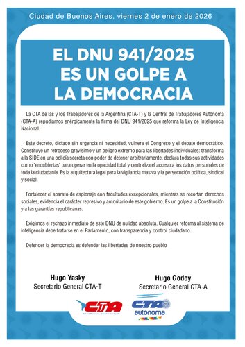 La CTA de las y los Trabajadores de la Argentina (CTA-T) y la Central de Trabajadores Autónoma (CTA-A) repudiamos enérgicamente la firma del DNU 941/2025 que reforma la Ley de Inteligencia Nacional.
