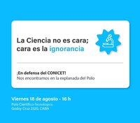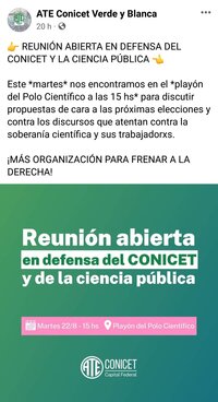 Mientras que el martes 22 de agosto a las 15:00, ATE Verde y Blanca Conicet convoca en el mismo lugar a una ’Reunión abierta en defensa del Conicet y de la ciencia pública’. “Todas las trabajadoras y trabajadores del Conicet nos damos cita en Godoy Cruz 2320, en el Polo Científico y Tecnológico, sede nacional del Conicet, para manifestar nuestra defensa del organismo, de sus actividades y de todo su personal”, anunció Girotti.