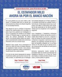 Como trabajadores y trabajadores rechazamos enérgicamente el decreto que permite convertir a nuestro Banco Nación en una S.A. e instamos a todos los bloques de ambas cámaras del Congreso Nacional a resguardar el patrimonio de los argentinos y las argentinas revocando de forma urgente las facultades delegadas por la Ley Bases número 27.742 antes de que su ejercicio provoque consecuencias más difíciles de revertir para el interés nacional.