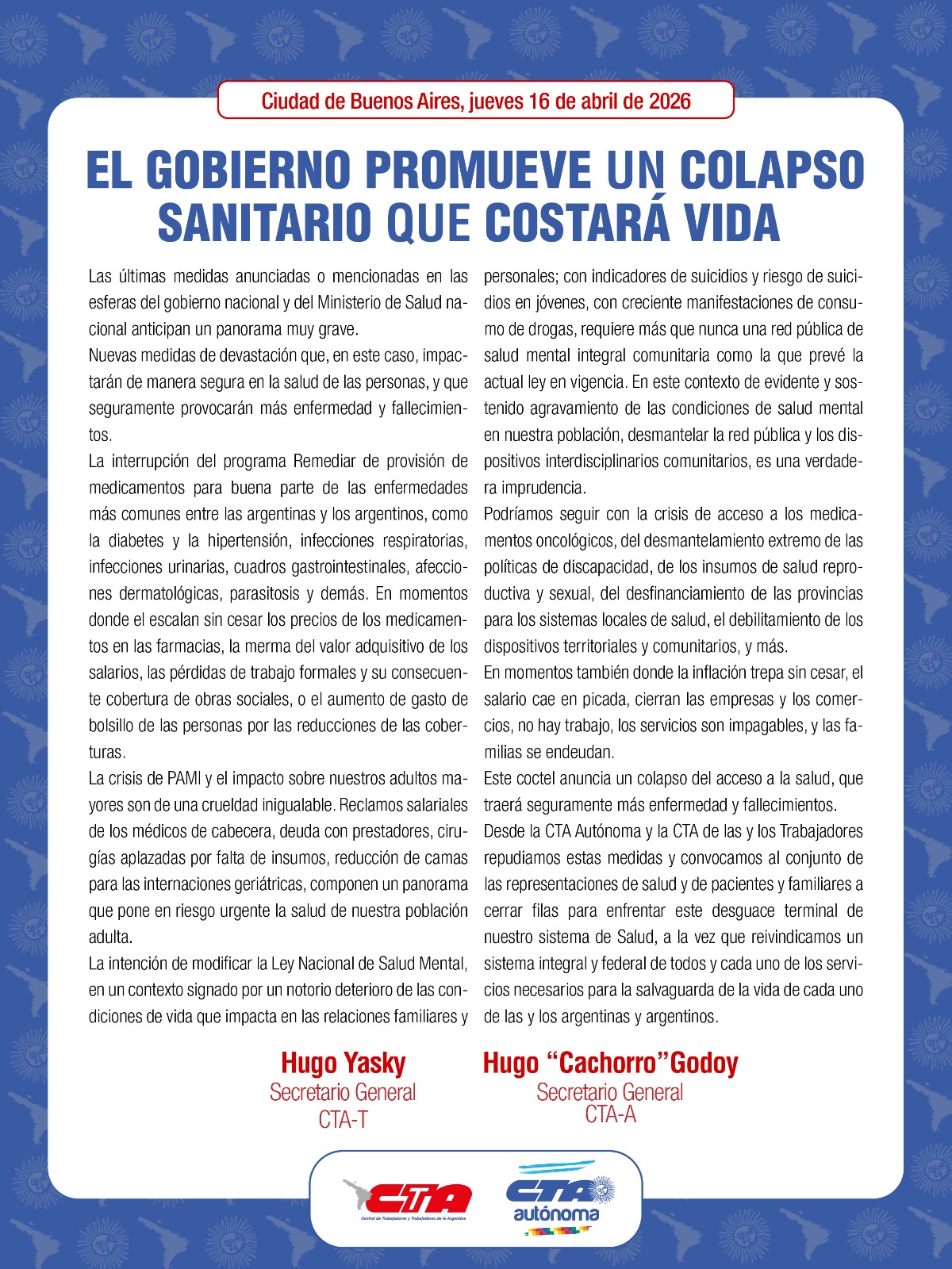 Desde la CTA Autónoma y la CTA de las y los Trabajadores repudiamos estas medidas y convocamos al conjunto de las representaciones de salud y de pacientes y familiares a cerrar filas para enfrentar este desguace terminal de nuestro sistema de Salud, a la vez que reivindicamos un sistema integral y federal de todos y cada uno de los servicios necesarios para la salvaguarda de la vida de cada uno de las y los argentinas y argentinos.