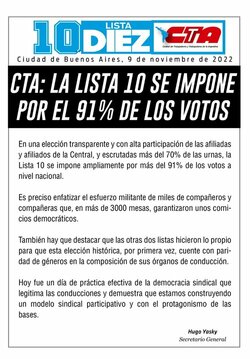 En ejercicio pleno de la democracia sindical, la Central de Trabajadores y Trabajadoras de la Argentina (CTA-T) votó este miércoles 9 su conducción. Con el 70% de las mesas escrutadas, la lista 10 -encabezada por el actual secretario general, Hugo Yasky - obtuvo la victoria con un 91%.