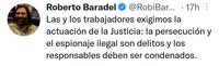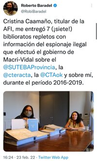 “Cristina Caamaño, titular de la AFI, me entregó 7 (¡siete!) biblioratos repletos con información del espionaje ilegal que efectuó el gobierno de Macri-Vidal sobre el Suteba, Ctera, la CTA y sobre mí durante el período 2016-2019”, informó Baradel. “Las y los trabajadores exigimos la actuación de la Justicia: la persecución y el espionaje ilegal son delitos y los responsables deben ser condenados”, destacó, y acompañó el posteo con una foto junto a la funcionaria y, sobre la mesa, los biblioratos grises.
