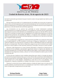 Ya no se puede seguir aceptando los condicionamientos del FMI ni las conductas antisociales de los especuladores. La CTA considera crucial que el Gobierno implemente un aumento uniforme mediante una suma fija que no puede ser inferior a $75.000 para todos los asalariados del país, sin excepciones. Para esto es imperativo asegurar que este incremento sea recibido tanto por el sector público a nivel nacional, provincial y municipal, como por el sector privado.