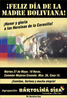 En este 27 de mayo, con nuestra agrupación Bartolina Sisa, festejaremos el día de la madre boliviana en nuestro comedor "Mujeres Creando" de la Villa 1-11-14. Fecha muy especial, ya que representa un hito histórico nuestroamericano, donde ha quedado grabado para siempre el espíritu de lucha y de dignidad de las madres y mujeres bolivianas, y con ellas las de toda America Latina frente al imperio español.
