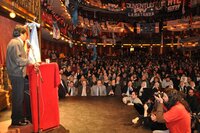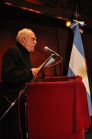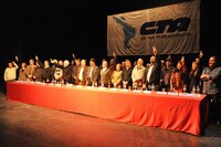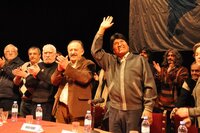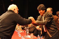 Eso ahí, en el Cervantes, catedral del teatro y ahora, desde el proscenio, Carlos Girotti anuncia la llegada de Presidente del Estado Plurinacional de Bolivia, Evo Morales. Y en semejante boca de escenario, ya están, además de la mesa nacional de la CTA, invitados de organizaciones sindicales y territoriales. Si, es Evo, Se sienta al lado de Hugo Yasky entre aplausos, vivas y Jallalla Evo, Jallalla! Sí, Evo dando respuesta a la invitación de la CTA. Evo que luego dirá que, no se siente presidente, que el tiene que pensar que es presidente, en realidad se siente sindicalista, se siente hombre de organización social, que ser presidente es algo que ni soñó.
