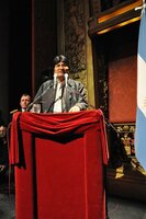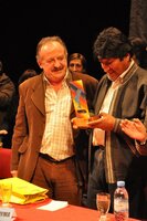 Evo Morales en el estrado. Como las luces son los reflectores del teatro, toda la iluminación da un aire, un recorte a los rostros, cuando menos, extraños para un acto político de esta envergadura. Evo es más alto de lo que parece en las fotos. También se le percibe cierta timidez, como se si le costara asumirse como presidente. Y el mismo, con su manera suave, no de orador, sino como alguien habituado a dialogar con el otro, dice: “Nunca pensé, nunca soñé y a veces no creo que soy presidente, me siento más dirigente sindical que presidente".