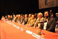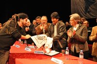 Hay pancartas que parecen saltar, o vuelan desde los altos palcos, hay aplausos, y otra vez resalta la palabra reconocimiento. Porque el acto del teatro Cervantes, tuvo mucho de eso, más que un homenaje, fue un reconocernos, por eso apareció el No al Alca, por eso las luchas, por eso la clase trabajadora, eso que nace desde el pie.