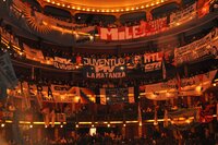 El teatro Cervantes y otra geografía humana, otras voces y los palcos colmados por rostros, todos esperando la llegada del presidente Evo Morales y hasta el asombro de las hermanas bolivianas con sus trajes tradicionales y sus saberes: ¡Jallalla Evo! ¡Jallalla Bolivia! ¡Jallalla Hugo! Madre Tierra. Y desde los palcos cuelgan banderas de organizaciones sociales, de la CTA, del Frente Transversal, del Comedor Los Pibes, de agrupaciones de La Matanza. Fetia, Suteba.