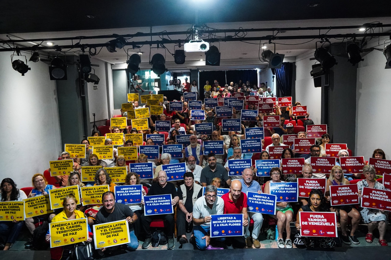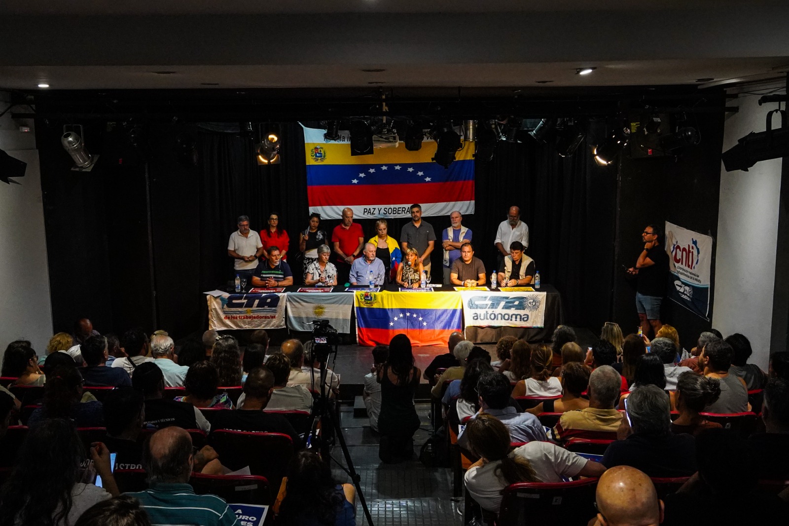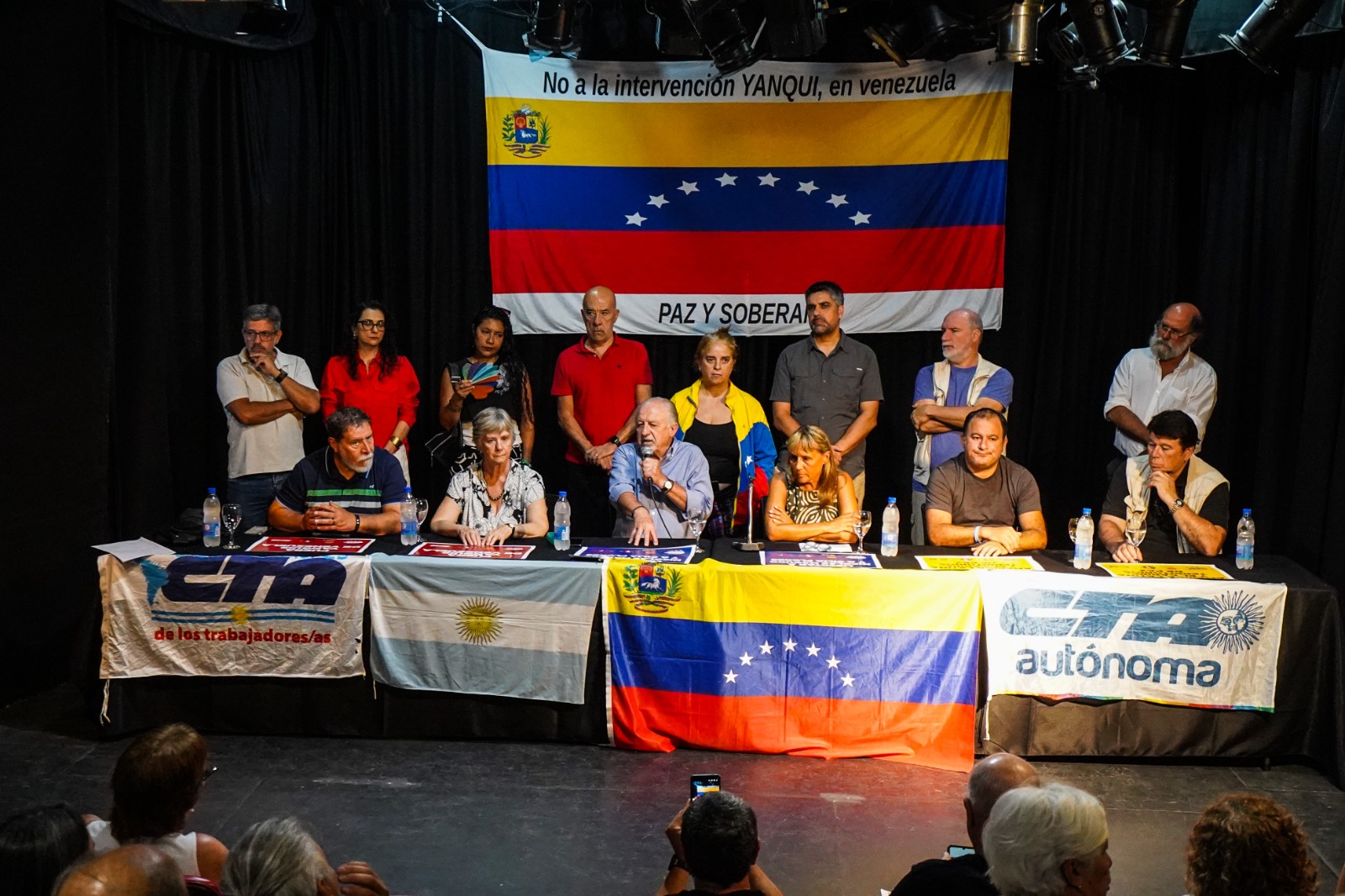 El Teatro La Máscara, en Piedras 736, CABA, fue sede del acto en defensa de la soberanía venezolana, en el marco de una convocatoria internacional impulsada por la Confederación Sindical de las Américas (CSA) y la Confederación Sindical Internacional (CSI) de CTA-T y CTA-A, junto a organizaciones sociales, políticas y de Derechos Humanos, en defensa de América Latina y el Caribe como territorio de paz. Se exigió la inmediata liberación de Nicolás Maduro y de Cilia Flores y se repudió la injerencia de Estados Unidos en la región.
