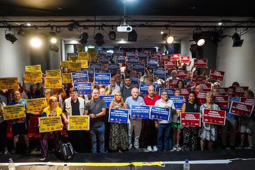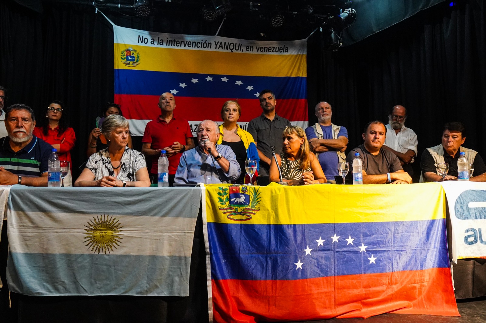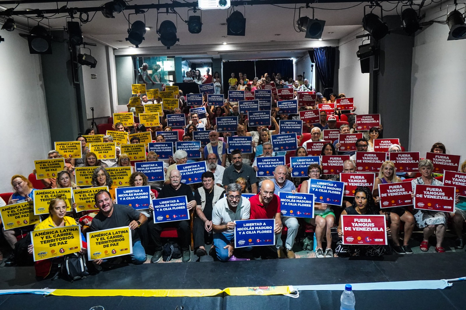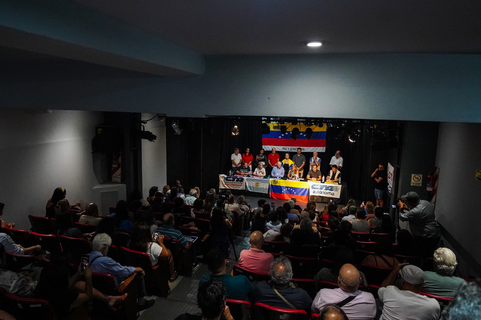 El Teatro La Máscara, en Piedras 736, CABA, fue sede del acto en defensa de la soberanía venezolana, en el marco de una convocatoria internacional impulsada por la Confederación Sindical de las Américas (CSA) y la Confederación Sindical Internacional (CSI) de CTA-T y CTA-A, junto a organizaciones sociales, políticas y de Derechos Humanos, en defensa de América Latina y el Caribe como territorio de paz. Se exigió la inmediata liberación de Nicolás Maduro y de Cilia Flores y se repudió la injerencia de Estados Unidos en la región.