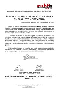 Desde la Asociación Gremial de Trabajadorxs del Subte y Premetro (AGTSyP - Metrodelegadxs) anunciamos que el jueves 16/9 desde las 20:00 hasta el cierre del servicio, las 6 líneas del subte y el premetro se verán interrumpidas ante la negativa de la empresa Metrovías de asignar tareas a nuestro compañero guarda Carlos Toledo.