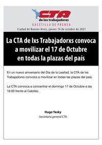 Portada del sitio > Nuestras Acciones > La Central Ciudad de Buenos Aires, jueves 14 de octubre de 2021 La CTA de lxs Trabajadorxs convoca a movilizar el 17 de Octubre en todas la plazas del país Jueves 14 de octubre de 2021 , por CTA Comunica En un nuevo aniversario del Día de la Lealtad, la CTA de lxs Trabajadorxs convoca a movilizar en todas las plazas del país. La CTA convoca a concentrar el domingo 17 de Octubre a las 16:00 frente al Cabildo. Hugo Yasky Secretario General CTA Seleccionar Mes articulos mensuales... abril de 2026 marzo de 2026 febrero de 2026 enero de 2026 diciembre de 2025 noviembre de 2025 octubre de 2025 septiembre de 2025 agosto de 2025 julio de 2025 junio de 2025 mayo de 2025 abril de 2025 marzo de 2025 febrero de 2025 enero de 2025 diciembre de 2024 noviembre de 2024 octubre de 2024 septiembre de 2024 agosto de 2024 julio de 2024 junio de 2024 mayo de 2024 abril de 2024 marzo de 2024 febrero de 2024 enero de 2024 diciembre de 2023 noviembre de 2023 octubre de 2023 septiembre de 2023 agosto de 2023 julio de 2023 junio de 2023 mayo de 2023 abril de 2023 marzo de 2023 febrero de 2023 enero de 2023 diciembre de 2022 noviembre de 2022 octubre de 2022 septiembre de 2022 agosto de 2022 julio de 2022 junio de 2022 mayo de 2022 abril de 2022 marzo de 2022 febrero de 2022 enero de 2022 diciembre de 2021 noviembre de 2021 octubre de 2021 septiembre de 2021 agosto de 2021 julio de 2021 junio de 2021 mayo de 2021 abril de 2021 marzo de 2021 febrero de 2021 enero de 2021 diciembre de 2020 noviembre de 2020 octubre de 2020 septiembre de 2020 agosto de 2020 julio de 2020 junio de 2020 mayo de 2020 abril de 2020 marzo de 2020 febrero de 2020 enero de 2020 diciembre de 2019 noviembre de 2019 octubre de 2019 septiembre de 2019 agosto de 2019 julio de 2019 junio de 2019 mayo de 2019 abril de 2019 marzo de 2019 febrero de 2019 enero de 2019 diciembre de 2018 noviembre de 2018 octubre de 2018 septiembre de 2018 agosto de 2018 julio de 2018 junio de 2018 mayo de 2018 abril de 2018 marzo de 2018 febrero de 2018 enero de 2018 diciembre de 2017 noviembre de 2017 octubre de 2017 septiembre de 2017 agosto de 2017 julio de 2017 junio de 2017 mayo de 2017 abril de 2017 marzo de 2017 febrero de 2017 enero de 2017 diciembre de 2016 noviembre de 2016 octubre de 2016 septiembre de 2016 agosto de 2016 julio de 2016 junio de 2016 mayo de 2016 abril de 2016 marzo de 2016 febrero de 2016 enero de 2016 diciembre de 2015 noviembre de 2015 octubre de 2015 septiembre de 2015 agosto de 2015 julio de 2015 junio de 2015 mayo de 2015 abril de 2015 marzo de 2015 febrero de 2015 enero de 2015 diciembre de 2014 noviembre de 2014 octubre de 2014 septiembre de 2014 agosto de 2014 julio de 2014 junio de 2014 mayo de 2014 abril de 2014 marzo de 2014 febrero de 2014 enero de 2014 diciembre de 2013 noviembre de 2013 octubre de 2013 septiembre de 2013 agosto de 2013 julio de 2013 junio de 2013 mayo de 2013 abril de 2013 marzo de 2013 febrero de 2013 enero de 2013 diciembre de 2012 noviembre de 2012 octubre de 2012 septiembre de 2012 agosto de 2012 julio de 2012 junio de 2012 mayo de 2012 abril de 2012 marzo de 2012 febrero de 2012 enero de 2012 diciembre de 2011 noviembre de 2011 octubre de 2011 septiembre de 2011 agosto de 2011 julio de 2011 junio de 2011 mayo de 2011