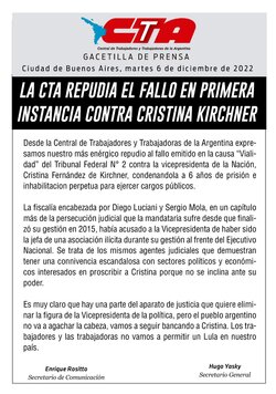 LA CTA REPUDIA EL FALLO EN PRIMERA INSTANCIA CONTRA CRISTINA KIRCHNER