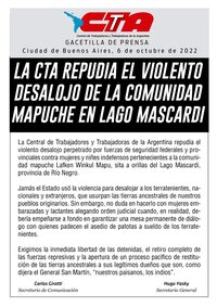 La Central de Trabajadores y Trabajadoras de la Argentina repudia el violento desalojo perpetrado por fuerzas de seguridad federales y provinciales contra mujeres y niñes indefensos pertenecientes a la comunidad mapuche Lafken Winkul Mapu, sita a orillas del Lago Mascardi, provincia de Río Negro.