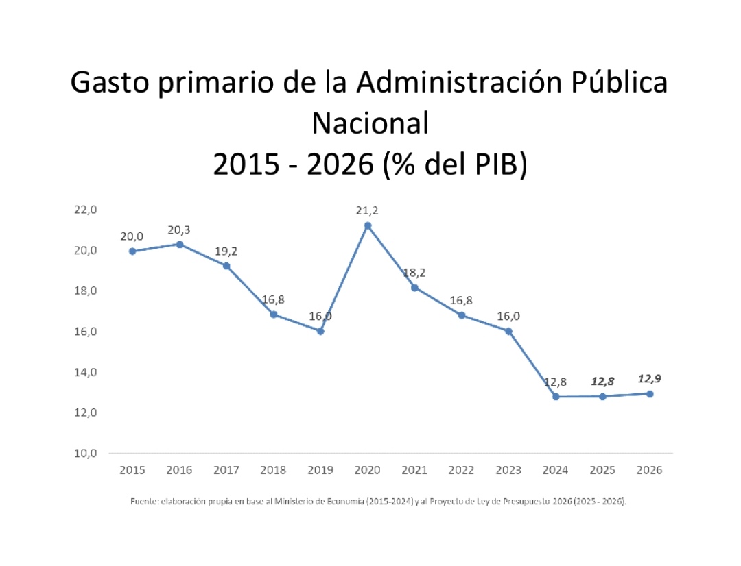 El Gobierno sostiene su estrategia en la denominada “meta fiscal”, dirigida exclusivamente a reducir de manera drástica el Gasto Público, sin implementar medidas para incrementar los ingresos del Estado. El peso de los gastos primarios sobre el PIB cayó de 16,0% en 2023 a 12,8% en 2024 y 2025, previendo sostenerse en ese nivel en 2026 (12,9%).