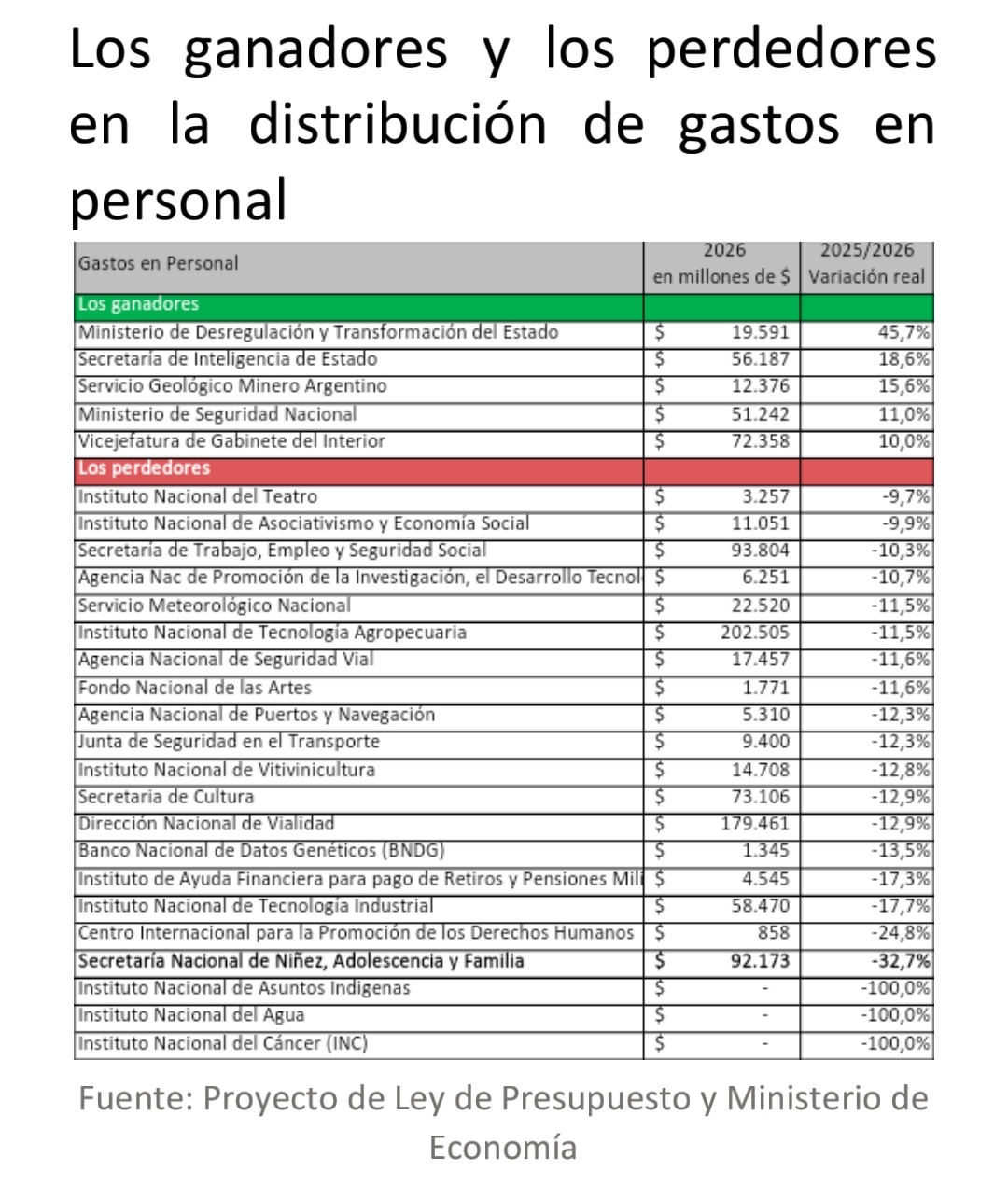 Se consolida la parálisis de organismos estratégicos y se profundiza la precarización laboral, mientras tanto, algunas áreas proyectan un crecimiento formidable de sus gastos en personal, como es el caso del Ministerio de Desregulación a cargo de Sturzenegger que crece un 45,7% y la Secretaría de Inteligencia que (sin contar los gastos reservados) aumentará sus gastos en personal en casi un 20%, en términos reales.