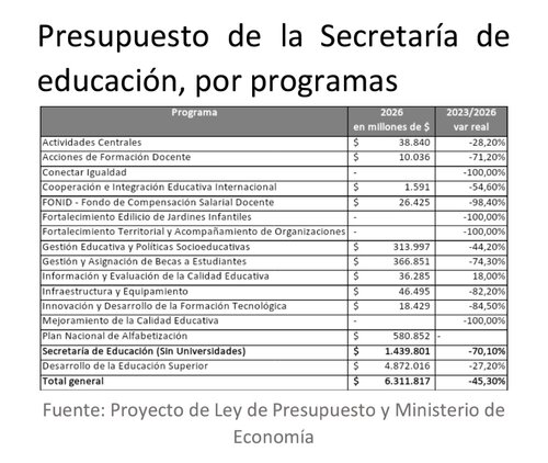 A esto se suma el abandono de la inversión educativa. Para cobrar una dimensión del problema cabe apuntar que el presupuesto educativo se redujo de manera sistemática en la última década, hasta alcanzar en el Proyecto de Ley de Presupuesto 2026 un nivel crítico de apenas 0,75% del PIB. Este proceso no responde a un ajuste transitorio, sino a una redefinición estructural y regresiva del rol del Estado en materia educativa.
