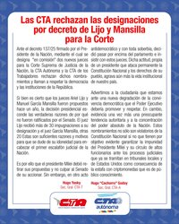 Las CTA rechazan las designaciones por decreto de Lijo y Mansilla para la Corte