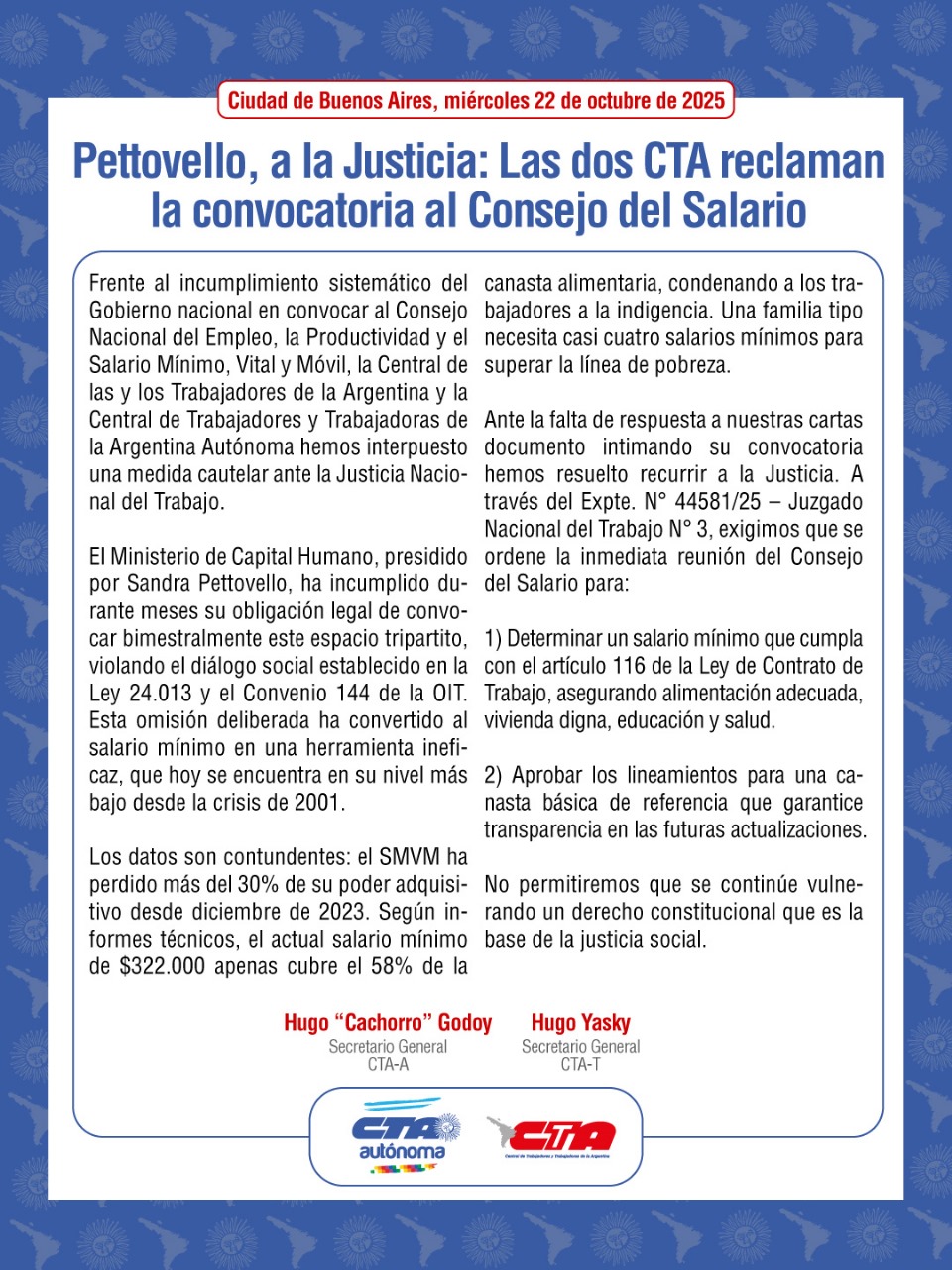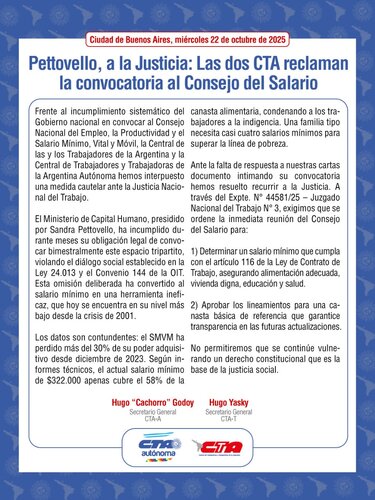 Frente al incumplimiento sistemático del Gobierno nacional en convocar al Consejo Nacional del Empleo, la Productividad y el Salario Mínimo, Vital y Móvil, la Central de las y los Trabajadores de la Argentina y la Central de Trabajadores y Trabajadoras de la Argentina Autónoma hemos interpuesto una medida cautelar ante la Justicia Nacional del Trabajo.