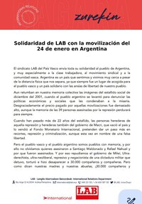 El sindicato LAB del País Vasco envía toda su solidaridad al pueblo de Argentina, y muy especialmente a la clase trabajadora, al movimiento sindical y a la comunidad vasca. Argentina es un país que sentimos y vivimos muy cerca a pesar de la distancia física que nos separa, ya que siempre fue un lugar de acogida para el pueblo vasco y un país solidario con las ansías de libertad de nuestro pueblo.