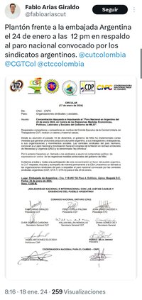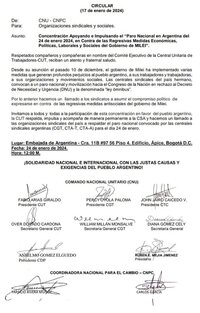 Invitamos a todos y todas a la participación de esta concentración en favor del pueblo argentino, la CUT respalda, impulsa y acompaña de manera permanente a la CSA y hacemos un llamado a las organizaciones sindicales del país a respaldar el paro nacional convocado por las centrales sindicales argentinas (CGT, CTA-T, CTA-A) para el día 24 de enero.