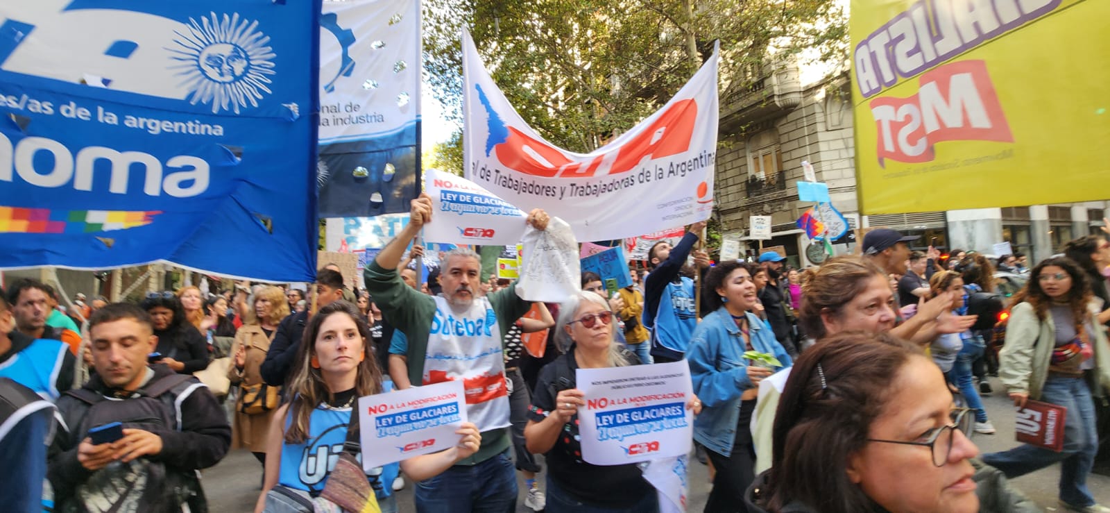 Durante la movilización, la secretaria de Ambiente, Cambio Climático y Transición Justa de la CTA-T, Silvana Franco, manifestó: “Este gobierno y sus aliados no pueden ignorar lo que pasa en la calle, la cantidad de gente inscripta en las audiencias públicas, truchas, no vinculantes y que no fueron ampliadas para que participe toda la ciudadanía. Y que, a pesar de eso, el 90% de los que participaron votaron en contra de la modificación de la ley de protección de glaciares”.