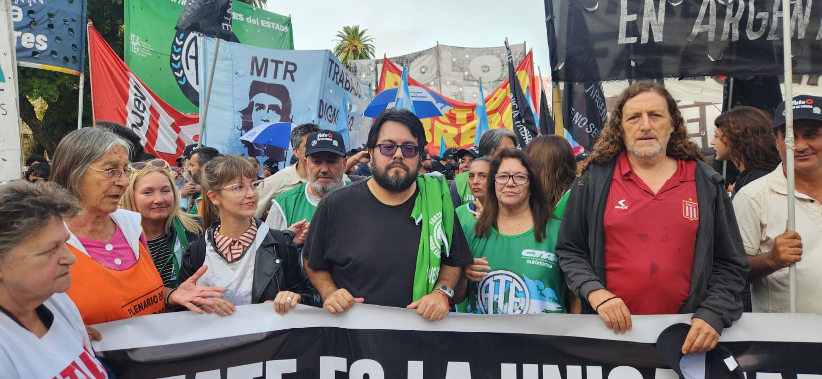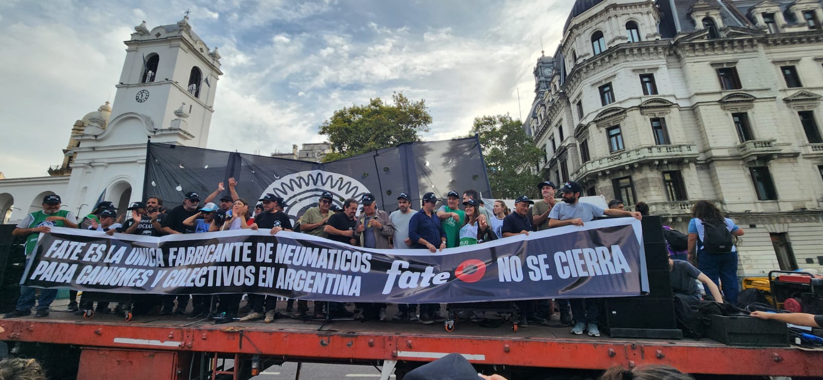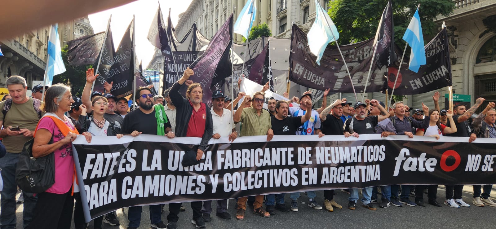 La CTA-T y CTA-A, junto a organizaciones sociales, sindicales y políticas, acompañaron este martes, el reclamo del SUTNA en Plaza de Mayo por la reapertura de la empresa fabricante de neumáticos Fate, la reincorporación de todxs lxs trabajadorxs despedidxs y el pago de los salarios adeudados.