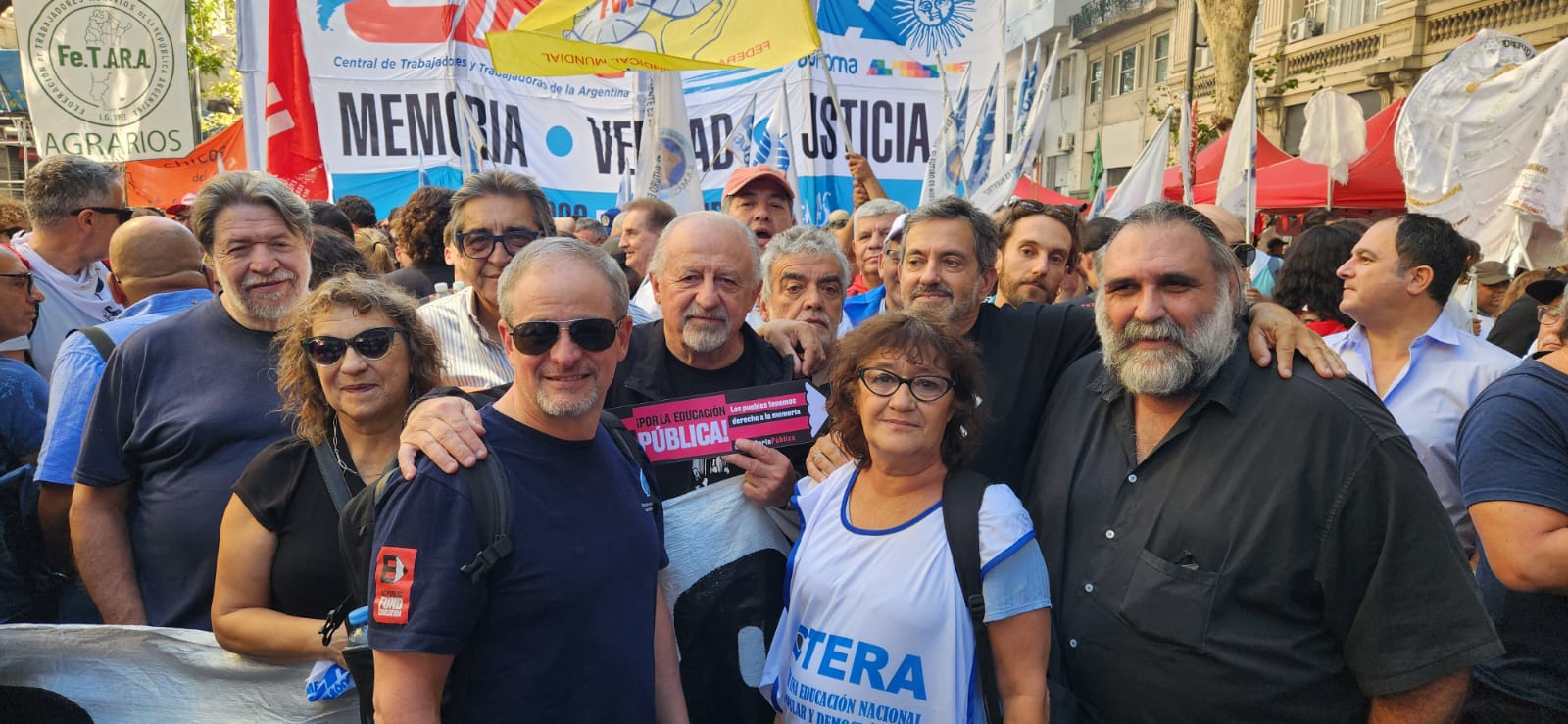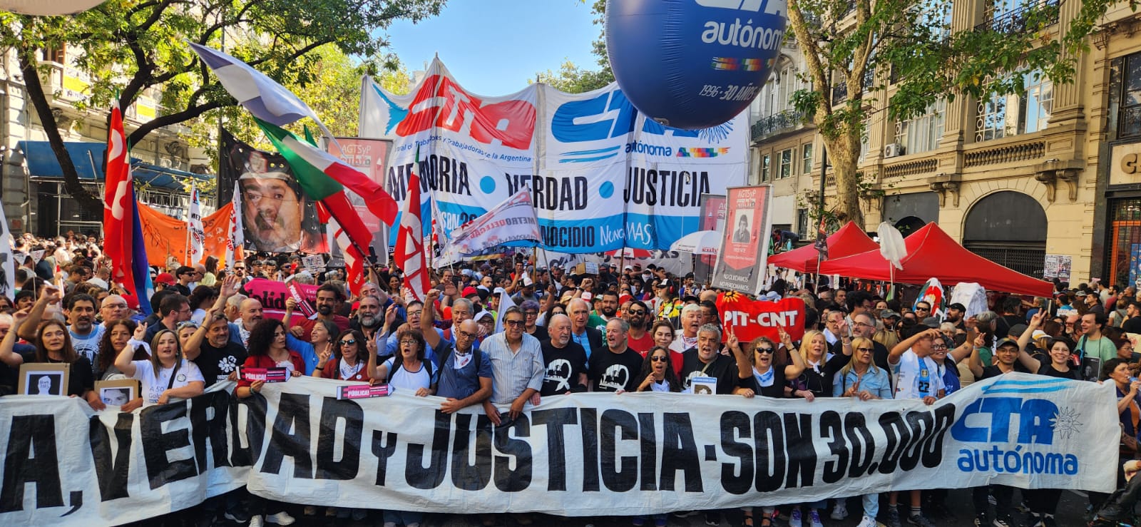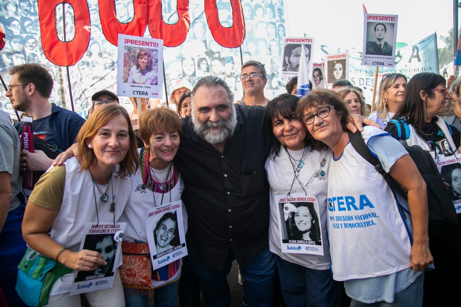 Roberto Baradel, secretario general del SUTEBA, CTA-T provincia de Buenos Aires y secretario de Relaciones Internacionales de la CTA-T Nacional, señaló: “Cientos de miles salimos a las calles hoy para decir Nunca Más. No queremos las políticas de odio, de crueldad de la dictadura militar, y tampoco las del gobierno de Milei”.