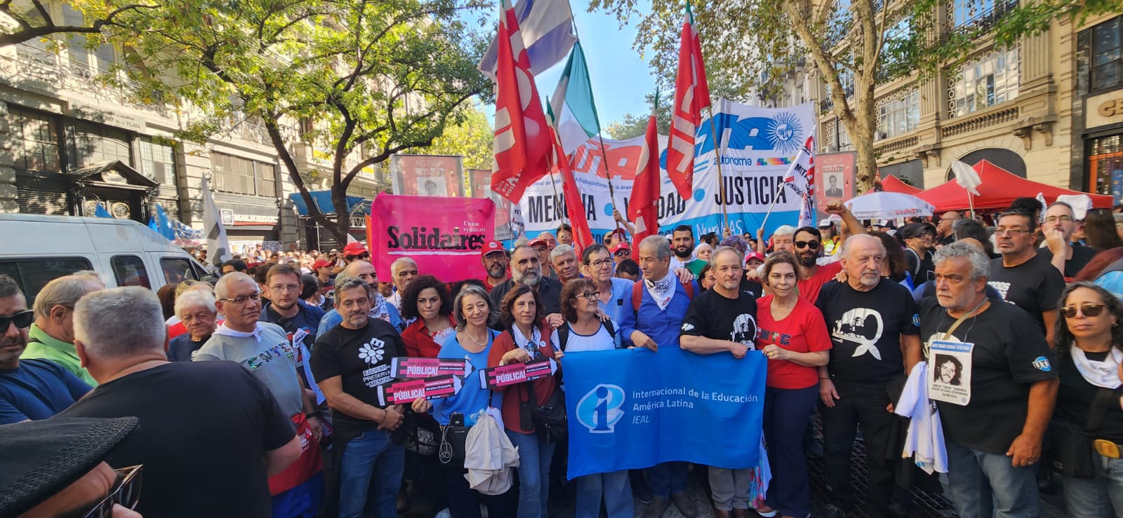 El secretario general de la Internacional de la Educación (IE), David Edwards, dijo: “Ustedes son un punto de referencia para el resto del mundo. Necesitamos que saquen a Milei de aquí y que se vayan todos los demás fachos del resto de los países, para que tengamos un mundo más justo y digno para los trabajadores y las trabajadoras”.
