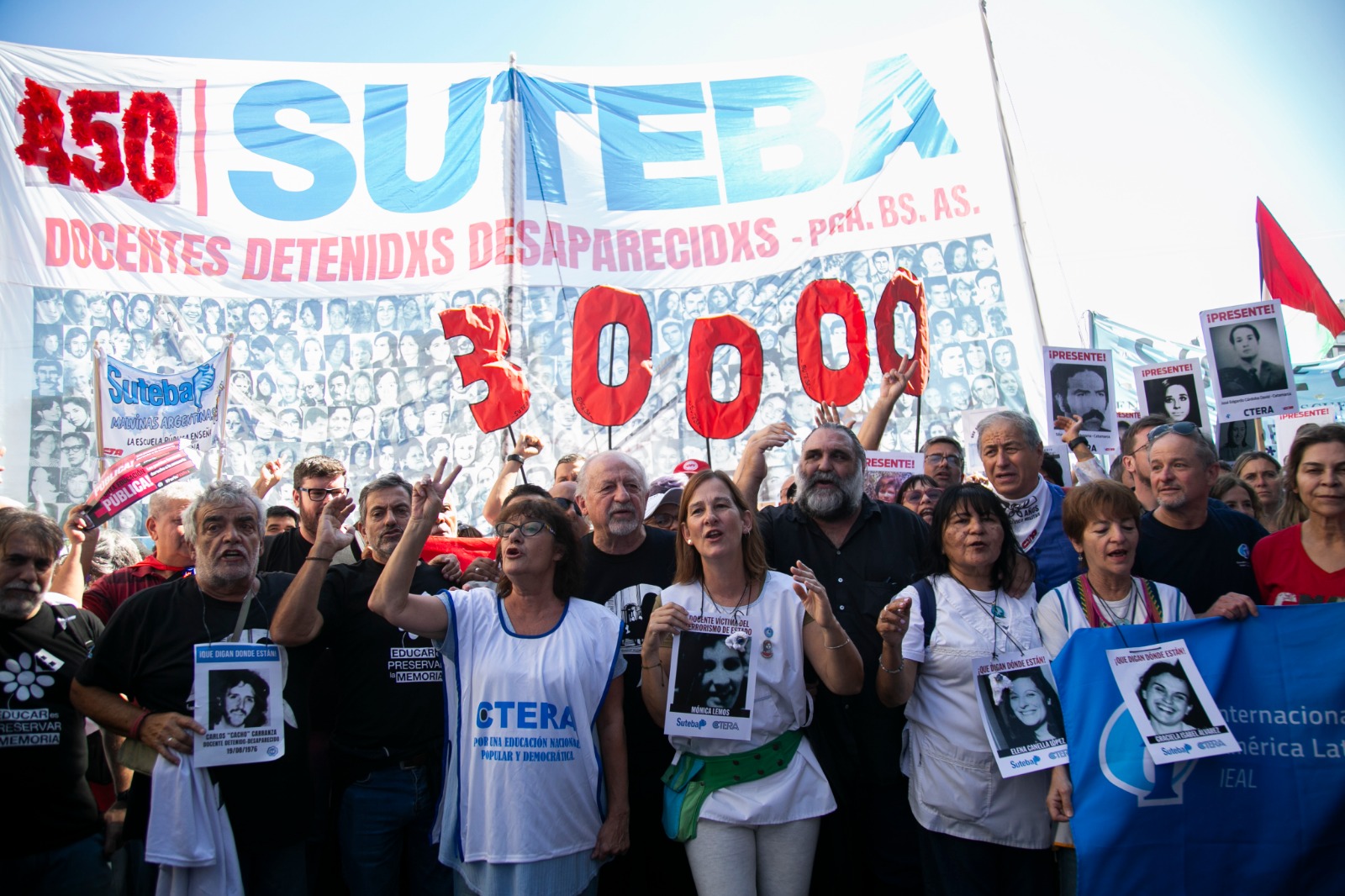 La secretaria general de la CTERA Sonia Alesso reclamó: “Queremos que nos digan dónde están nuestros compañeros y compañeras. Luchamos por los 880 docentes desaparecidos, son 30.000 y no nos reconciliamos, no perdonamos y no olvidamos”.
