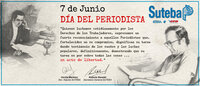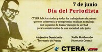 El SUTEBA felicitó a los periodistas en su día enviando una tarjeta en la que expresan: "Quienes luchamos cotidianamente por los derechos de los trabajadores, expresamos un fuerte reconocimiento a aquellos periodistas, que fortalecidos en su compromiso, dignifican su tarea dando testimonio de los sueños y las luchas populares, definitivamente, demostrando que su tarea es por sobre todas las cosas un acto de libertad", firmada por Roberto Baradel, titular de SUTEBA y la secretaria adjunta Cecilia Martinez.