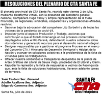 En la tarde del viernes 2 de julio, mediante plataforma virtual, se llevó a cabo un plenario de la CTA Santa Fe con la participación de Hugo Yasky, secretario general Nacional, compañeros de Mesa Nacional, de la Comisión Ejecutiva Provincial, secretarios generales y/o adjuntos de las Regionales 9 de Julio, Vera, Obligado, San Cristóbal, San Justo, Castellanos, La Capital, San Martín, Iriondo, Rosario, General López. También estuvieron presentes referentes de los sindicatos AMSAFE, ATE, SPR, APSF, APA, APUC, ACTORES, COAD, SATE, SUPASO, TECNICOS DEPORTIVOS, UTEPLIM, SOEVA y REMISEROS, así como referente de cooperativas y asociaciones civiles afiliadas, adherentes y colaboradores de la Central. Luego de un los informes sectoriales y un amplio debate, se resolvió: