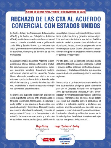 La Central de las y los Trabajadores de la Argentina (CTA-T) y la Central de Trabajadores Autónoma (CTA-A) manifestamos nuestro más firme rechazo al acuerdo comercial anunciado entre el gobierno de Javier Milei y Estados Unidos, por considerar que afecta gravemente la soberanía nacional, el desarrollo económico, el empleo y los derechos de las y los trabajadores.
