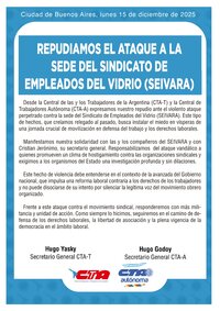 Desde la Central de las y los Trabajadores de la Argentina (CTA-T) y la Central de Trabajadores Autónoma (CTA-A) expresamos nuestro repudio ante el violento ataque perpetrado contra la sede del Sindicato de Empleados del Vidrio (SEIVARA). Este tipo de hechos, que creíamos relegado al pasado, busca instalar el miedo en vísperas de una jornada crucial de movilización en defensa del trabajo y los derechos laborales.